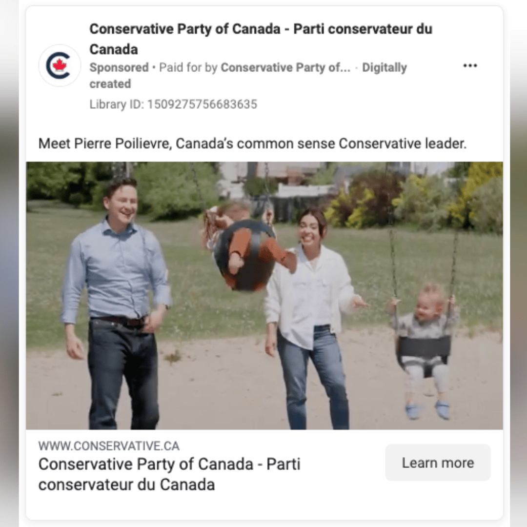 Canada’s common sense Conservative leader used digitally created or altered media in this new “Meet the family“ ad. Advertisers must disclose whenever an ad about social issues, elections, or politics contains a photorealistic image or video or realistic-sounding audio that was digitally created or altered to depict any of the following: