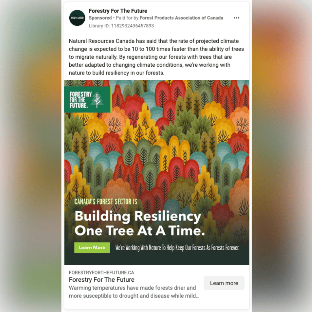 Forestry For The Future and Voice for Energy spent a combined $30k this week promoting Forestry and Fracked Gas. Forestry For The Future has long taken a more traditional approach to greenwashing the forestry industry, leveraging claims about resiliency, logging as a method of building “climate change adapted” forests and promoting using wood as a building material.
