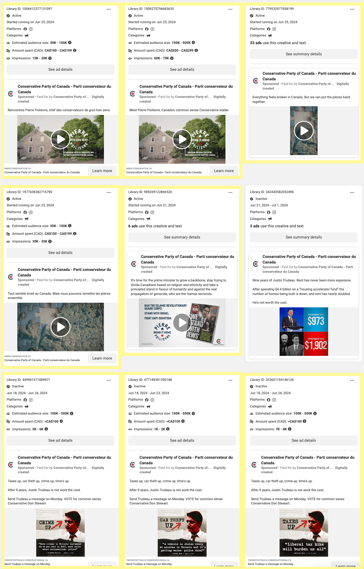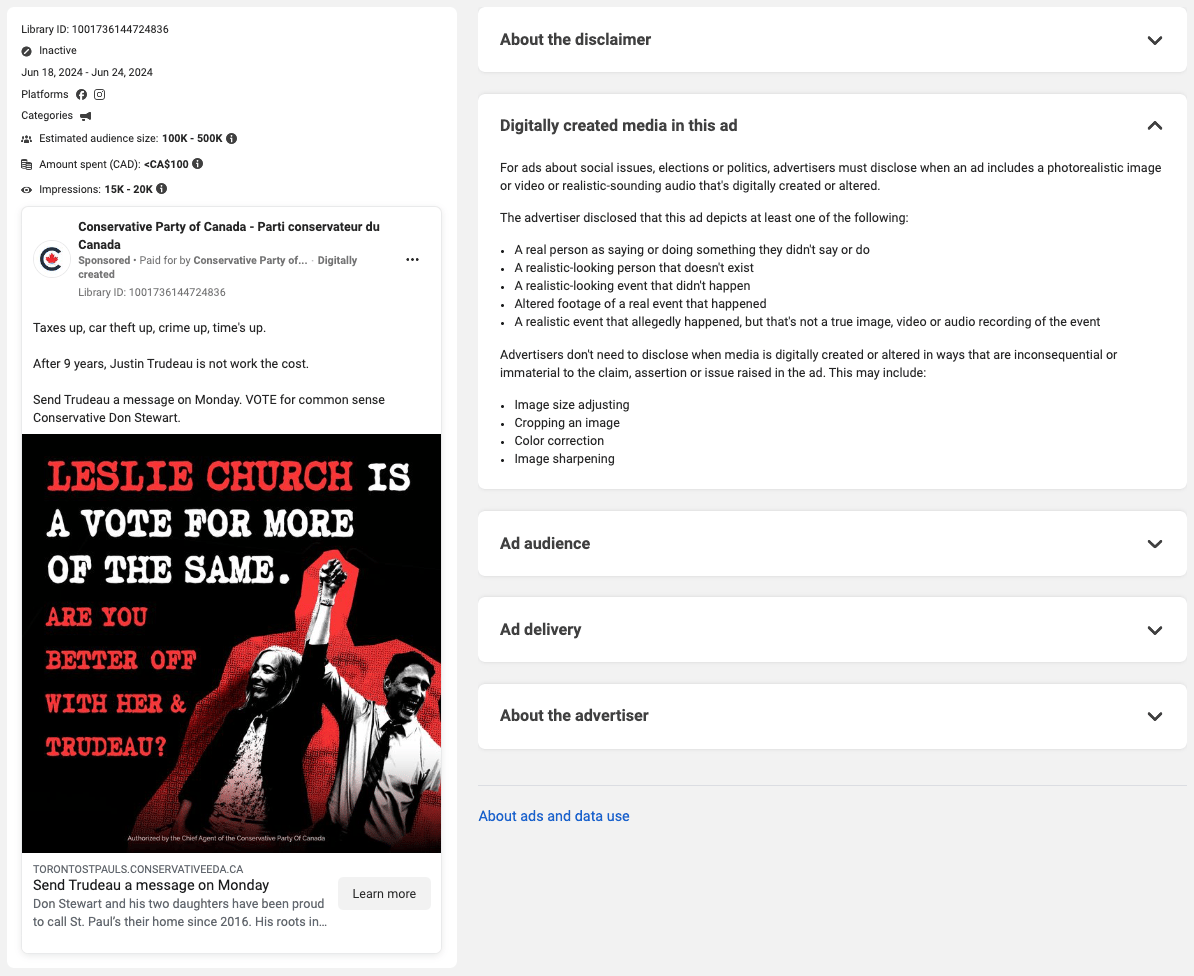 All but one of the most recent ads from the Conservative Party of Canada are flagged as including “Digitally created“ content.