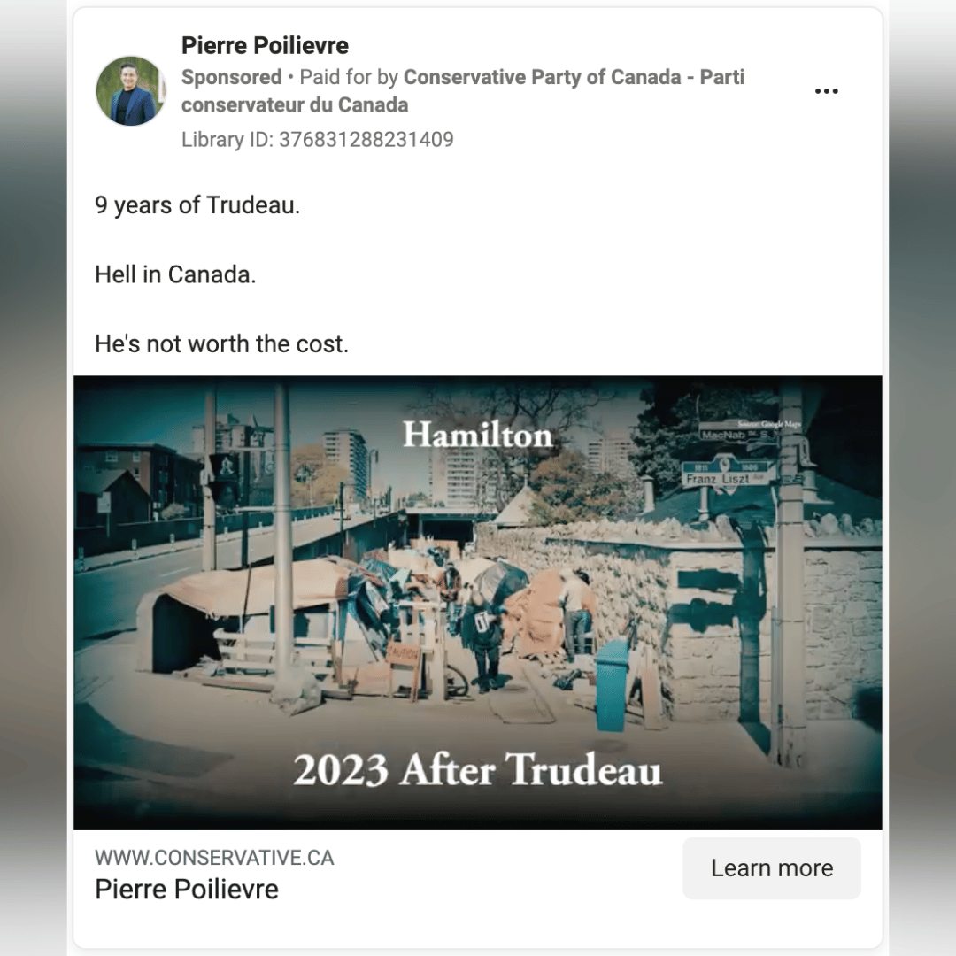 The Conservative Party of Canada has launched a new ad targeting Justin Trudeau, focusing on the issue of rising homelessness. The ad features an audio clip of Trudeau from before he was elected, saying, "It's time for a change in this country, my friends, a real change." This phrase is repeated over images of towns and cities showing homelessness encampments from 2023, contrasting them with photos from before his tenure.
