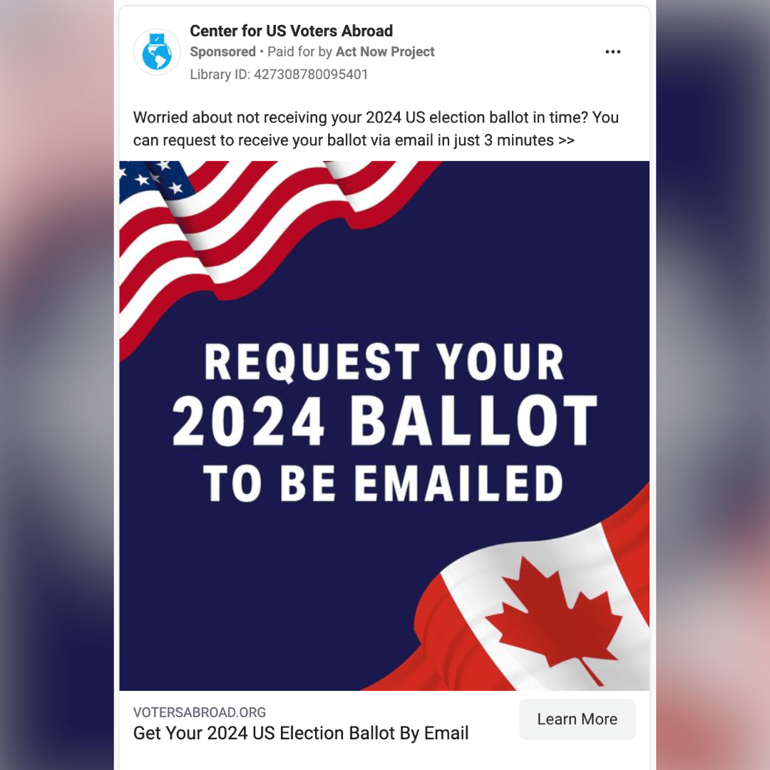 Democratic group “Centre for US Voters Abroad“ has spent ~$60k in the last seven days encouraging Americans internationally to request their ballots ahead of their upcoming election. The ads are running in Canada, the United Kingdom, Mexico, and Japan and though the ad pictured above doesn’t suggest that the group leans in a particular direction, some previous ads that they’ve run attacking Trump and their specific exclusion targets give their allegiance away.