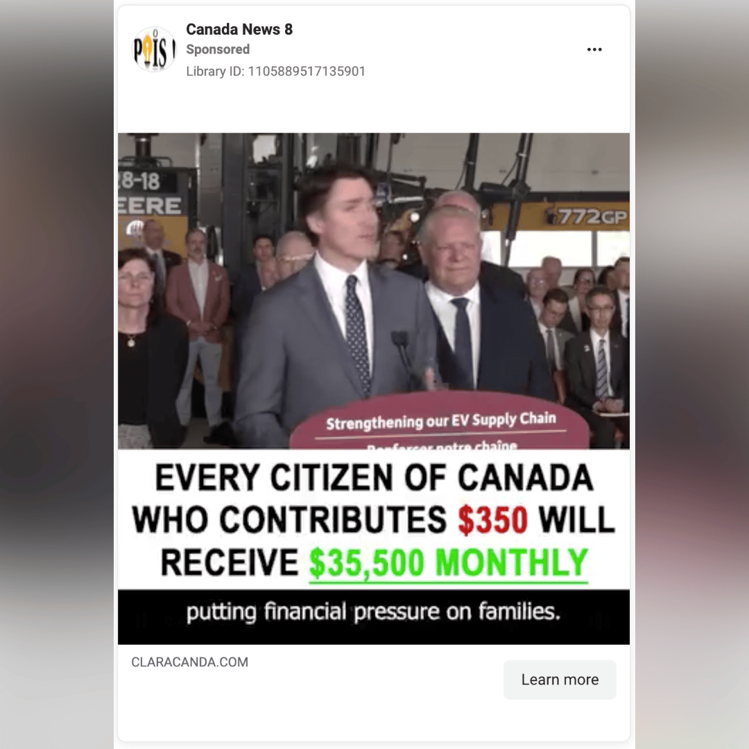In the last seven days, the top ten political advertisers spent $145,330 in Canada. This week, we’re covering another new ad by the Conservative Party of Canada, US Politics bleeding across the border, and a resurgence of crypto scams using the Prime Minister’s voice.