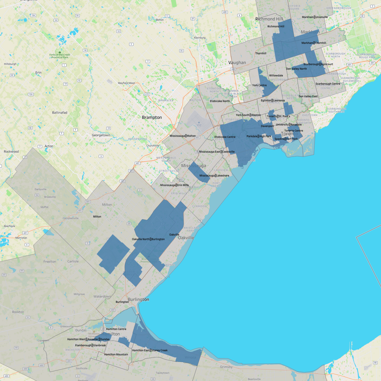 Scarborough - Agincourt Richmond Hill Toronto St. Paul’s Spadina - Fort York York South - Weston Mississauga Centre Oakville North - Burlington Milton | Don Valley North Thornhill Don Valley West Davenport Etobicoke Centre Mississauga - Cooksville Hamilton Centre | Markham - Thornhill York Centre Toronto Centre Parkdale - High Park Etobicoke - Lakeshore Oakville Hamilton East - Stoney Creek |