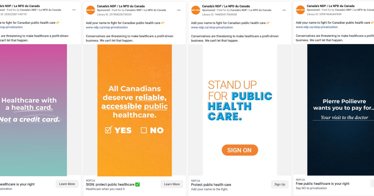 The New Democratic Party launched a suite of new ads at the end of this reporting period. Focused on Healthcare and labelling Danielle Smith and Doug Ford as “Pierre’s Premiers,“ they appear to be testing a few visual styles and options to see which is most resonant.