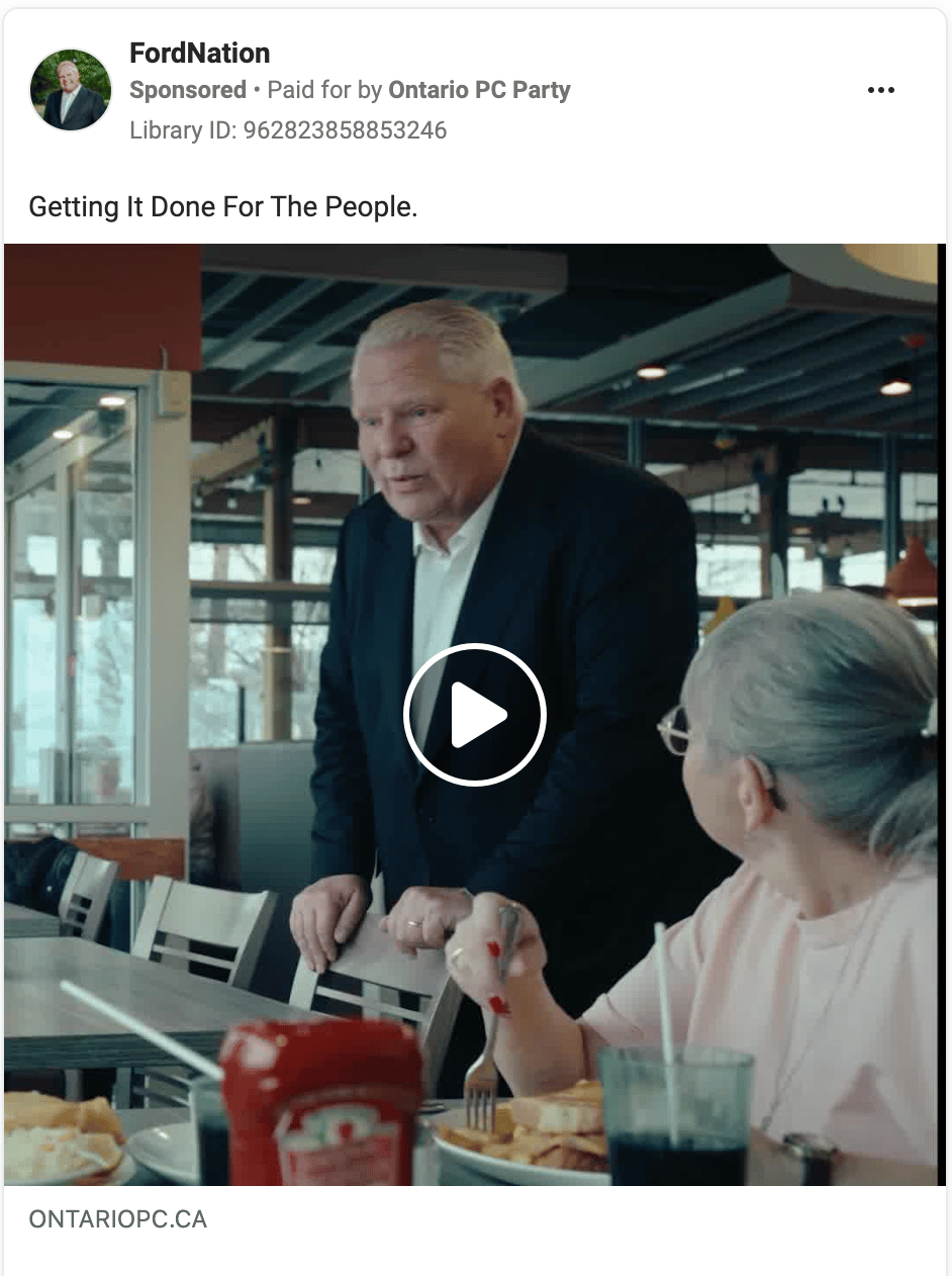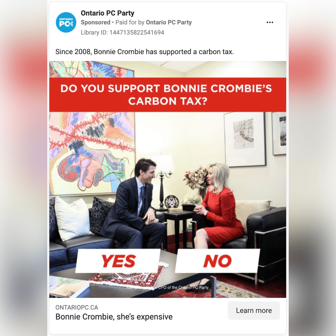 This week, the OPC spent $22,991 (including spend by the leader’s page) on ads that pin the carbon tax on Ontario Liberal Party leader Bonnie Crombie and on personal-brand ads for Doug Ford targeted at Mississauga, Caledon, Brampton and the wider Ontario area. To put this spending in perspective, the Ontario Liberal Party has spent $1,391, and the Ontario New Democratic Party has spent $2,811 in the same period.